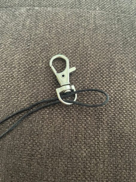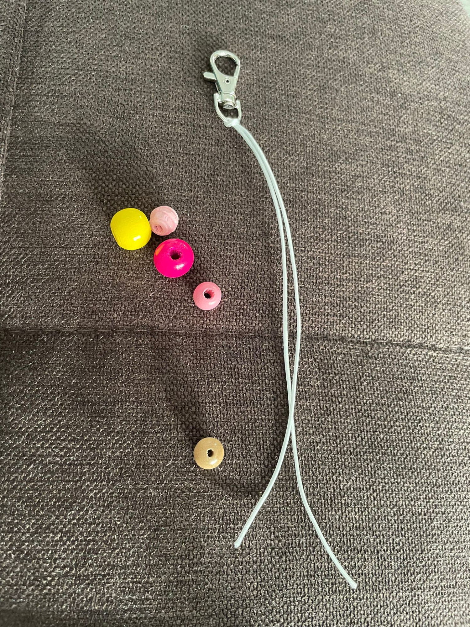 Zuerst machst du in der Mitte von der Schnur eine Schlaufe und fädelst diese durch den unteren Ring des Karabiner-Hakens. Anschließend nimmst du die zwei offenen Enden und fädelst diese durch die Schlaufe. Wenn du nun an den offenen Enden ziehst, ist die Schnur fest am Karabiner. Nun kannst du loslegen und nach Herzenslust auffädeln. Beachte bitte hierbei nur: Es ist eine kleinere Kugel dabei, die ein kleineres Loch als alle anderen Kugeln hat. Diese Kugel muss ganz zum Schluss aufgefädelt werden, da du so besser einen Knoten machen kannst, ohne dass alle Kugeln wieder rausfallen. Wenn alle Kugeln aufgefädelt sind, kannst du den Anhänger mit 1 oder 2 Knoten schließen. Um auf Nummer sicher zu gehen, kannst du jetzt noch den Knoten mit Heißkleber oder einem Flüssigkleber zusätzlich fixieren. Außerdem kannst du die Enden ggf. abschneiden und mit einem Feuerzeug die Enden verschmelzen, sodass der Faden nicht ausfranzt. Und fertig ist dein Anhänger!