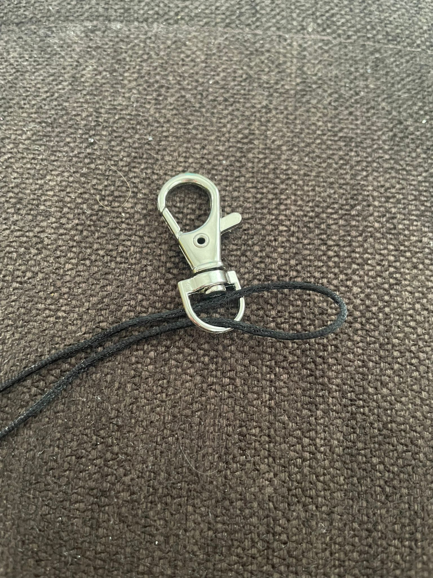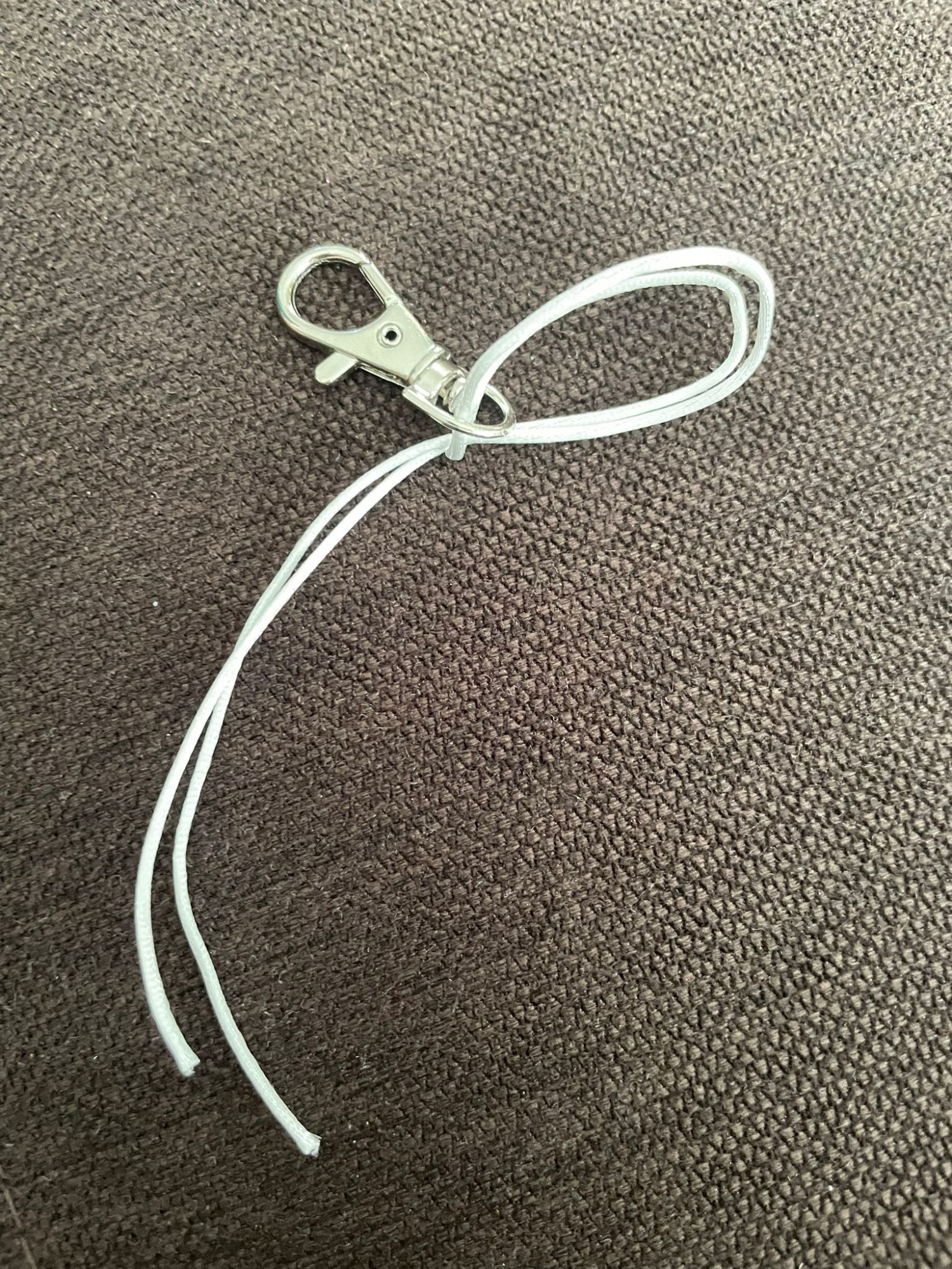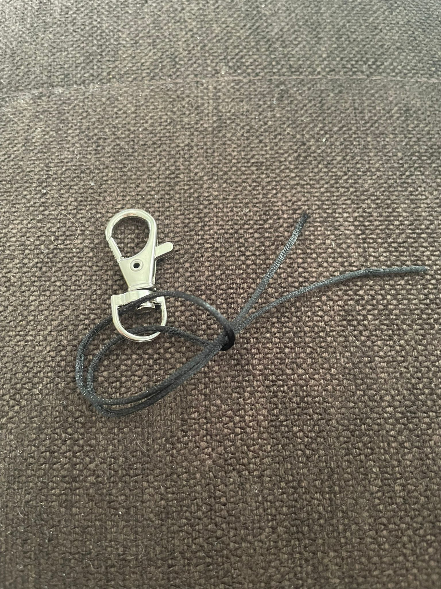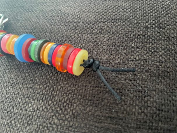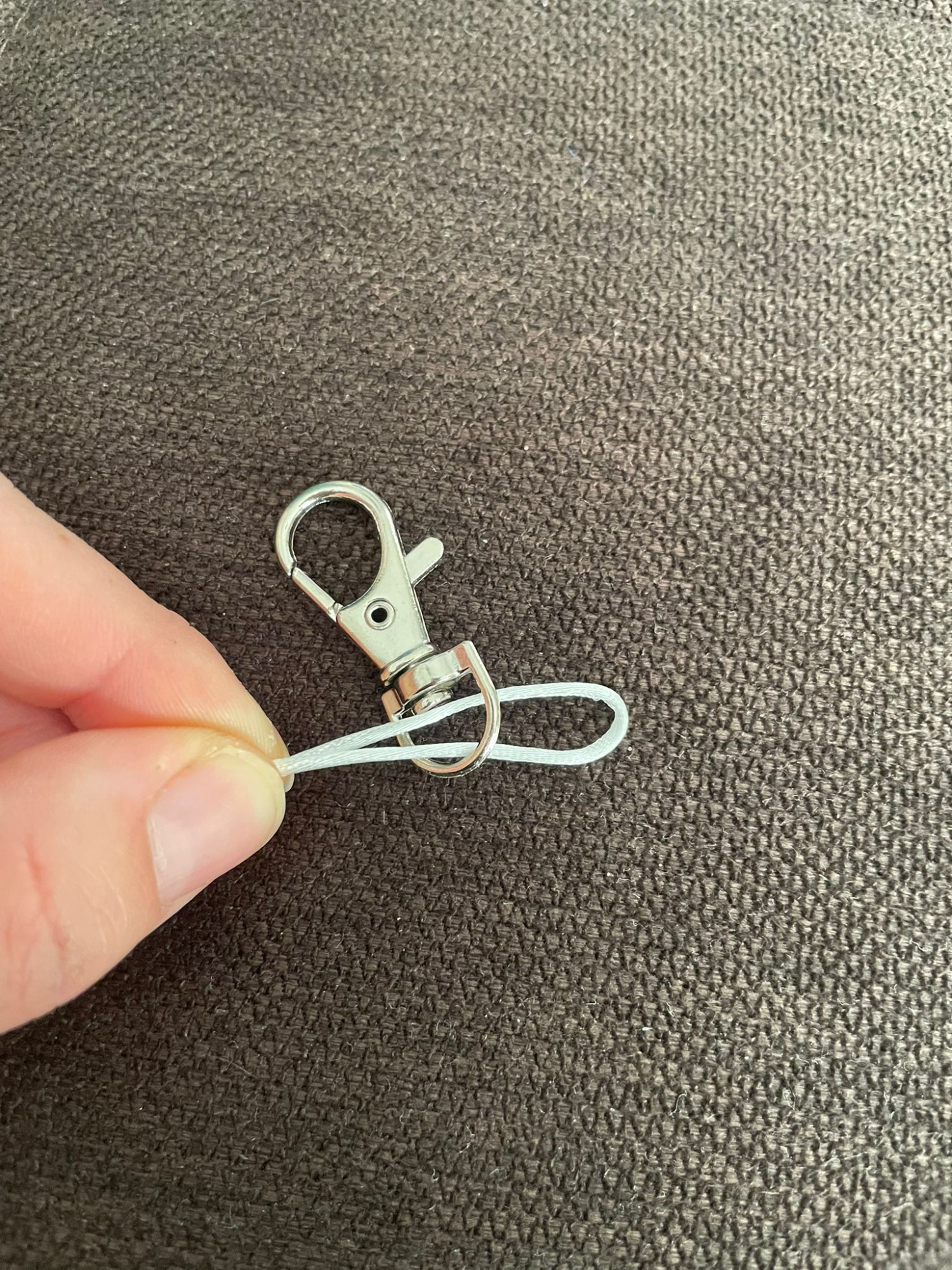 Zuerst machst du in der Mitte von der Schnur eine Schlaufe und fädelst diese durch den unteren Ring des Karabiner-Hakens. Anschließend nimmst du die zwei offenen Enden und fädelst diese durch die Schlaufe. Wenn du nun an den offenen Enden ziehst, ist die Schnur fest am Karabiner. Nun kannst du loslegen und nach Herzenslust auffädeln. Da du zwei offene Enden hast, werden immer beide Schnüre durch einen Knopf (je in ein Loch) gefädelt. Wenn alle Knöpfe aufgefädelt sind, kannst du 1-2 Knoten machen und diesen ggf. mit Kleber noch fixieren. Die Enden kannst du kürzen und ggf. mit einem Feuerzeug verschmelzen.