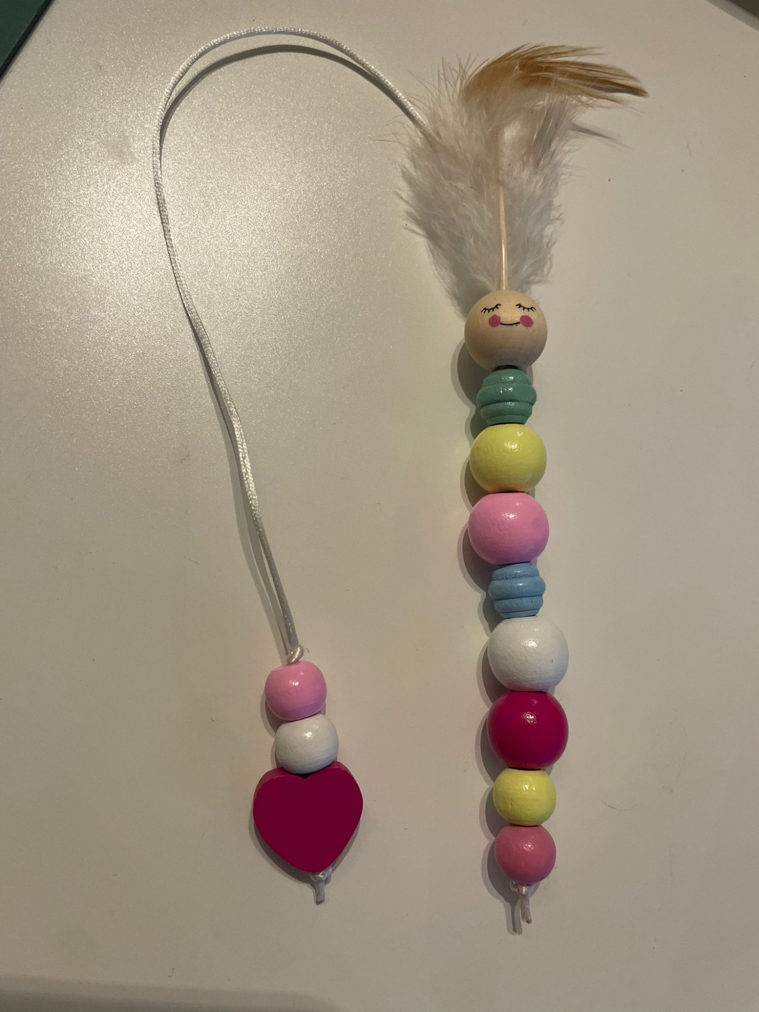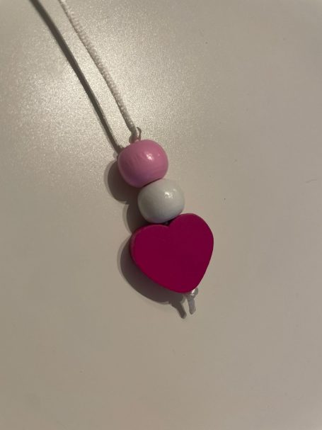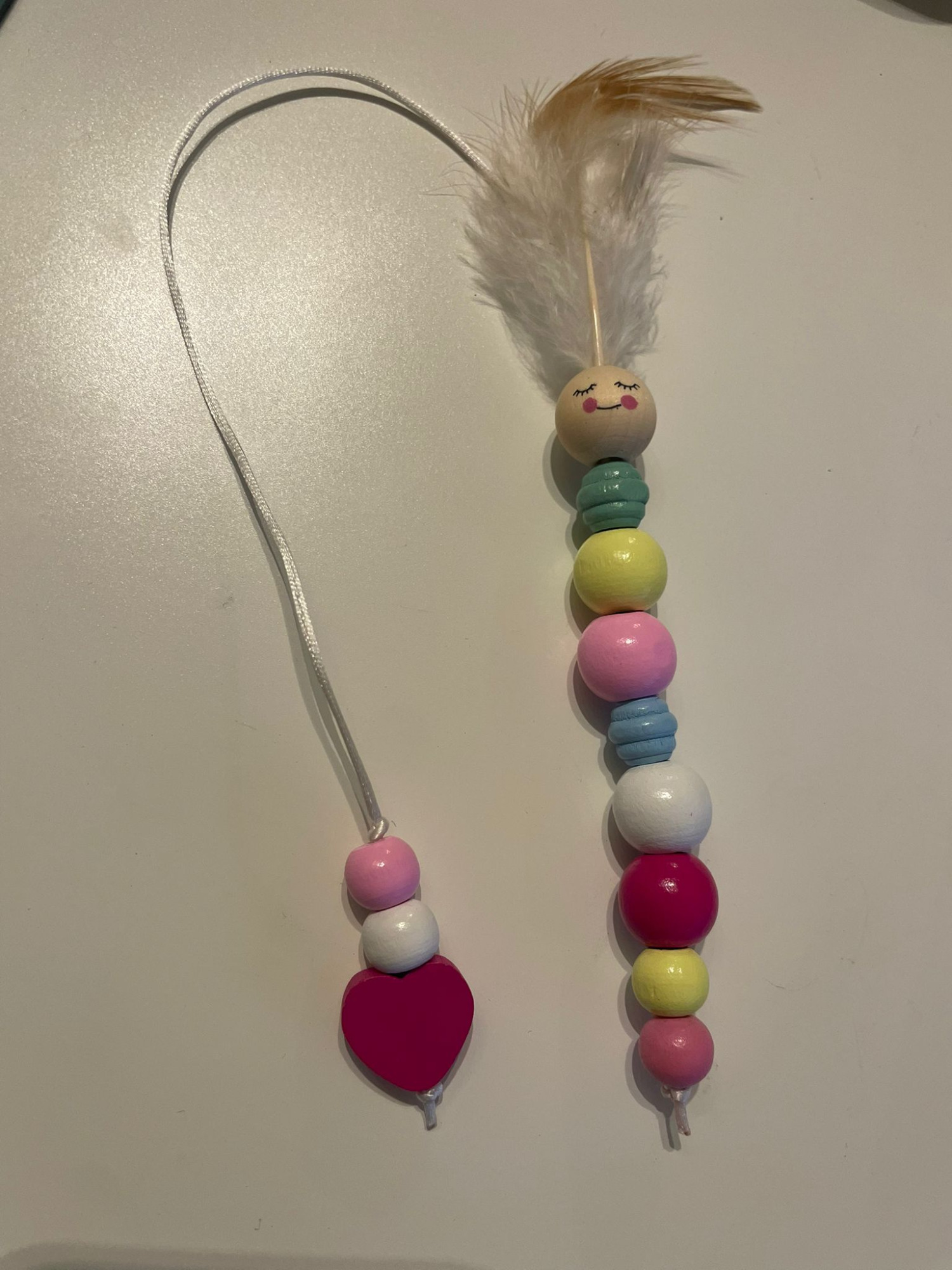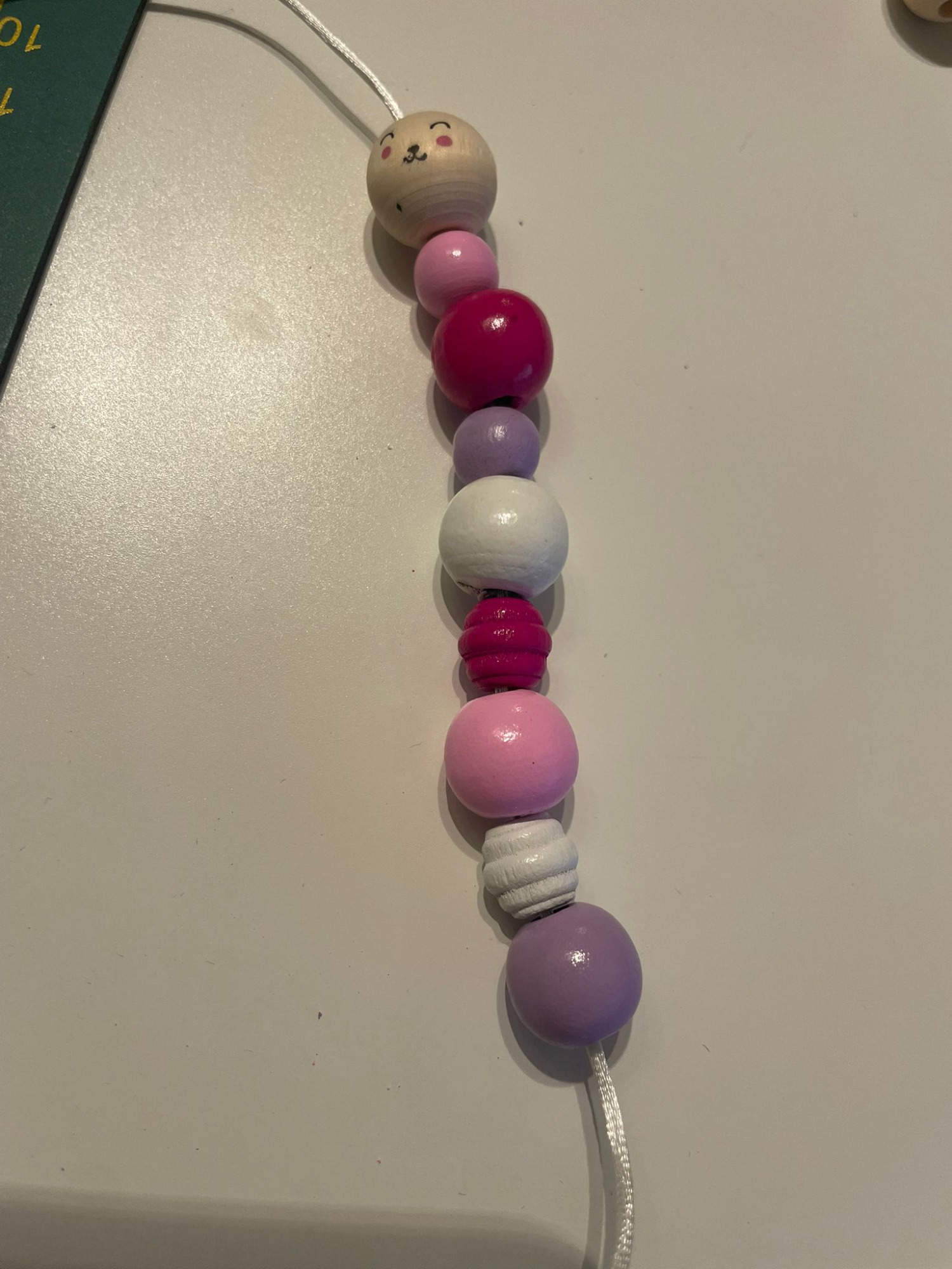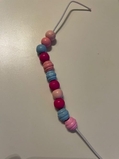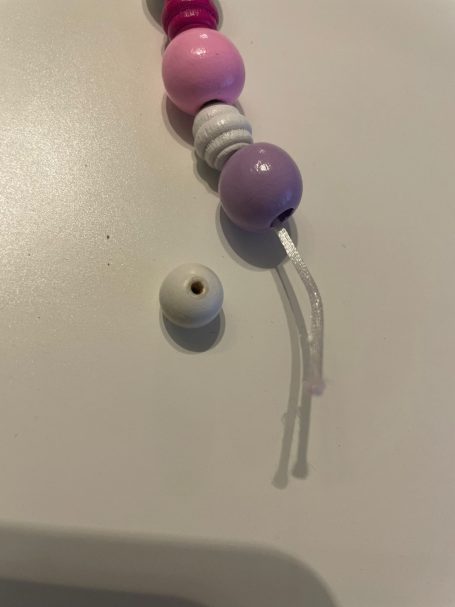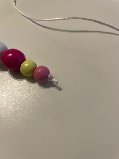 Als erstes machst du einen Knoten an eine Seite, sodass keine Perlen mehr herausfallen können. Anschließend fädelst du als erstes die Symbol-Perle (Herz, Stern, Krone) und anschließend zwei beliebig kleine Perlen auf. Nach diesen zwei Perlen machst du mind. 2 Knoten und fixierst diesen ggf. mit Kleber. Anschließend misst du einen Abstand von mind. 21 cm und machst dort dann wieder mind. 2 Knoten. Anschließend werden zuerst die Perle mit dem Gesicht und dann nach Belieben alle anderen Perlen aufgefädelt. Achte bitte hierbei darauf, dass sich eine Perle mit einem kleineren Loch wie alle anderen Perlen mit in der Tüte befindet. Diese Perle muss zum Schluss aufgefädelt werden. Außerdem rutschen dir wahrscheinlich alle nun aufgefädelten Perlen über den Knoten über der Gesichts-Perle. Das liegt an der Lochgröße der Perlen und wird gleich geändert.
